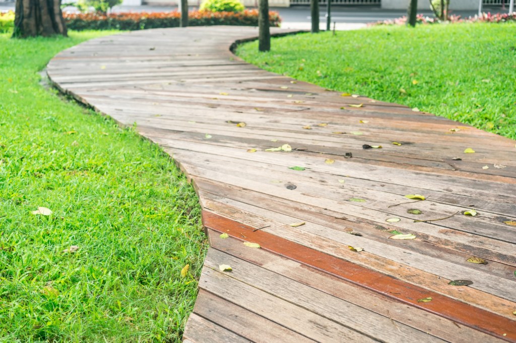 Il existe plusieurs manières d’intégrer le bois dans un jardin grâce aux allées, la plus convoitée étant l’allée sous forme de chemin de fer : la structure est composée de traverses de bois, chaque pièce doit au moins mesurer 1 m afin de faciliter la circulation.