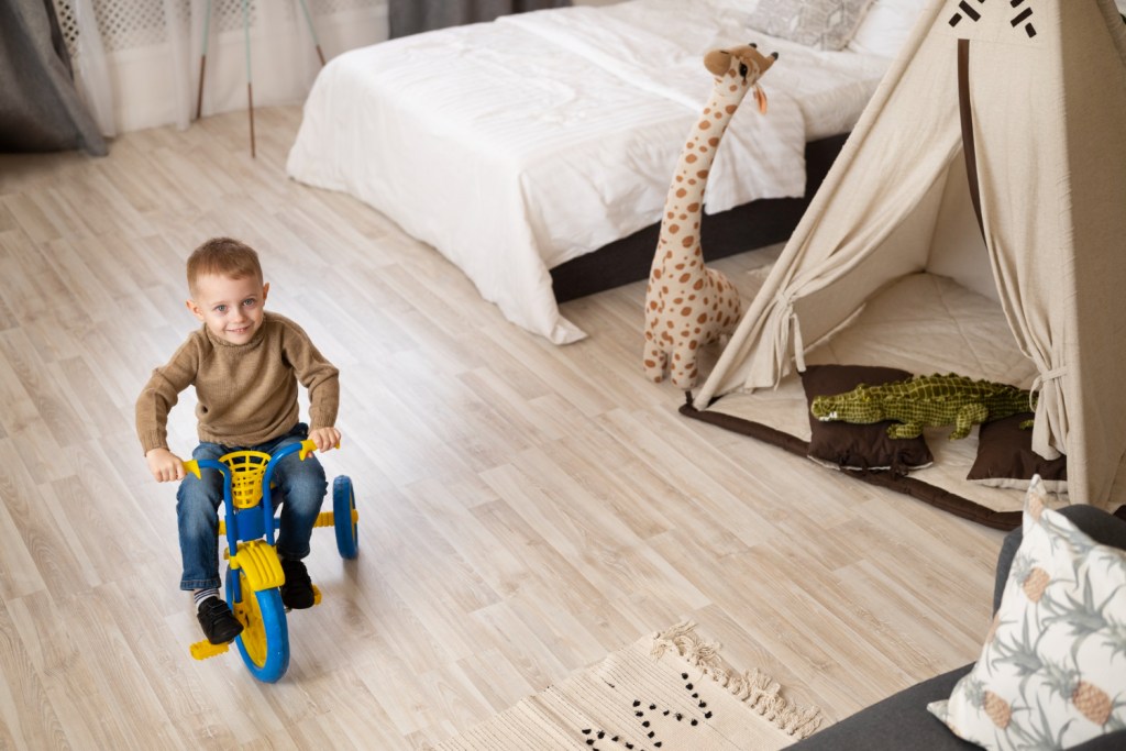 La résistance à l’usure est importante car les enfants sont actifs et exercent une pression importante sur le sol, que ce soit en jouant, en courant ou en déplaçant des meubles.