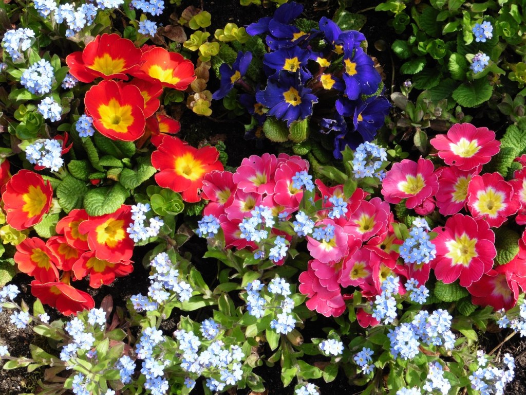 Pour que vos tapis fleuris soient flamboyants, le myosotis peut être accompagné de primevères et de pâquerettes.